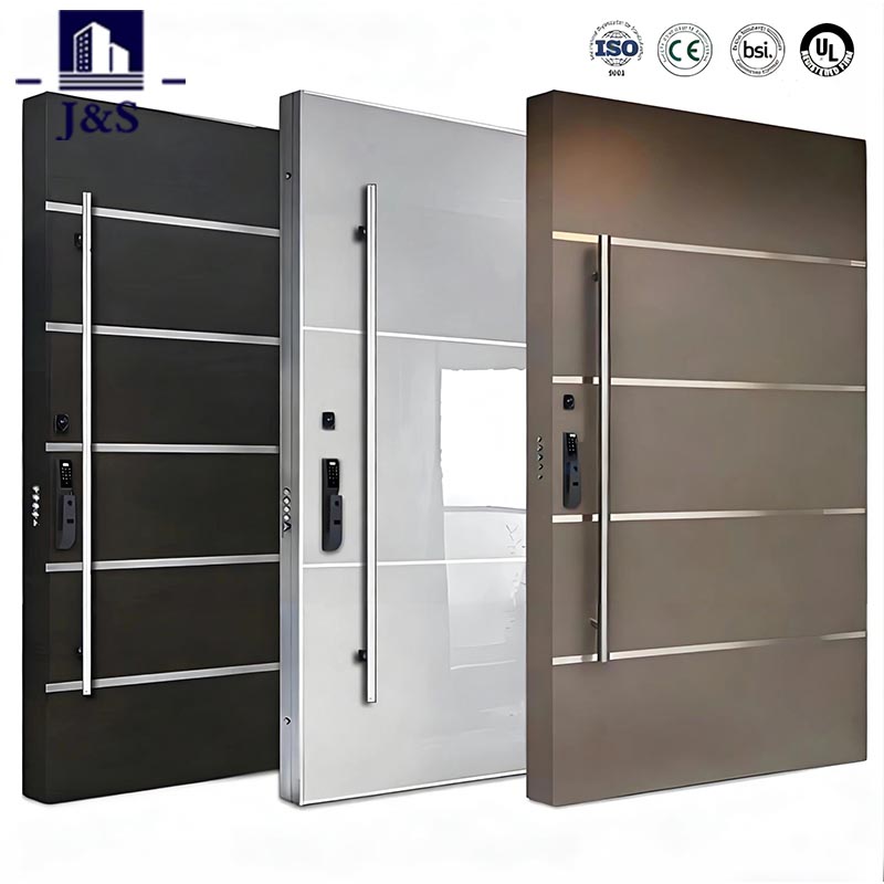 Eleve sua entrada com a porta de segurança de aço da J&S, oferecida a preços competitivos por um fabricante confiável da China. Combinando segurança robusta com uma estética moderna e minimalista, possui elegantes tiras de metal horizontais e uma estrutura de aço inoxidável durável. Projetada para proteção antirroubo e resistência às intempéries, esta porta de segurança em aço é perfeita para entradas residenciais e comerciais. Seu sofisticado acabamento fosco complementa exteriores contemporâneos, enquanto a superfície lisa e fácil de limpar garante brilho duradouro. Atendendo aos mais altos padrões de segurança, está disponível em tamanhos personalizados para se ajustar perfeitamente à sua porta, tornando-o a escolha ideal para compradores que procuram um fornecedor confiável ou fonte de fábrica.